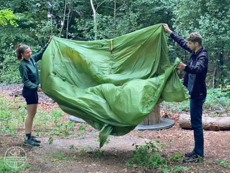 Na aankomst werd door Michiel en Patrick gedemonstreerd hoe je hangmatten ophangt en welke typen hangmatten er zijn. Geïnteresseerden konden een zogeheten ‘gathered end’ met underquilt uittesten. Hier moet je diagonaal in liggen. Verder was er een hangmat van het type ‘bridge hammock’ met stokjes, die ook als bivakzak is te gebruiken. Dit type is geschikter voor buikslapers. Geïnteresseerde deelnemers konden elke nacht in een ander type hangmat slapen om het verschil te ervaren.