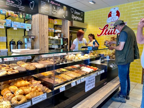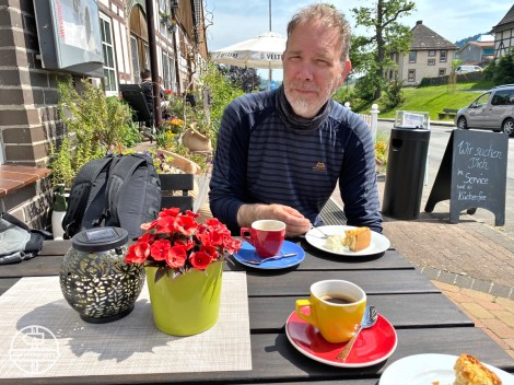 Lunchen deden we ofwel in de berm met wraps en beleg maar meestal bij de bakkerij in een supermarkt (Rewe, Edeka) of een Backerei/Konditorei. Bijna elke bakker heeft stoeltjes, tafeltjes en een toilet. Ook zijn er veel Eiscafés in Duitsland, waar je meestal ook koffie en gebak kunt krijgen (geschikt voor second breakfast). Als koffieliefhebber krijg je het overigens zwaar in dit land: overal krijg je koffie uit een automaat geserveerd.
