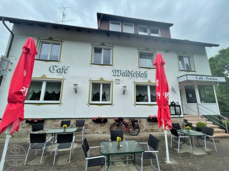 Vandaag wordt er onweer verwacht. Precies rond het moment van tent opzetten en koken. We keken tijdens het fietsen om ons heen en zagen weggewaaide daken en omgewaaide bomen, nog maar onlangs opgeruimd. Het kan hier kennelijk spoken! Dus boekte ik een hotelletje in Holzminden, een plaatsje waar we vandaag doorheen kwamen via de R1. Maar net als dat Weesp tegenwoordig in Amsterdam ligt, lag hotel Waldschloss op 10,9 kilometer afstand van Holzminden. Op een heuvel van 383 meter hoog, met een steile 10 procents gravelweg er naartoe die we in de laagste versnelling beklommen. In een wolk van wel twintig vliegen die het op ons zout hadden voorzien.