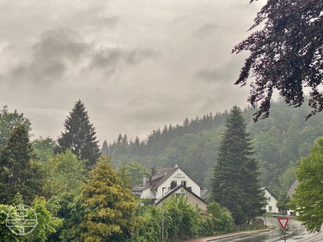 Helaas was de beloning van de helse beklimming een tweederangs schnitzelrestaurant en een verouderd hotel met doorgezakt bed. Alles ziet er hier nog uit zoals in de jaren ’60. Volgens de aardige kletsgrage Nederlandse eigenaar, die de drukte van Nederland is ontvlucht, hebben we de mooiste kamer, hij noemt het zelfs een suite. We zien een standaard kamer met twee stoeltjes tegen het voeteneind van het bed aangezet. Maar het hotel ligt wel mooi op de heuvel. Het is zelfs mooi terwijl het buiten grijs en nat is.