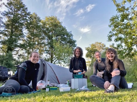 De dames wilden naar de camping in Rietberg in een Pod-huisje, maar die bleken later op de dag volgeboekt. We bleven hen de hele dag tegenkomen en uiteindelijk hebben we ze meegenomen naar dit adresje waar we de enige vier kampeerders zijn. Het is hier erg mooi en stil, met hazen en fazanten. Eindelijk ook weer lekker weer. We genieten en het is gezellig.