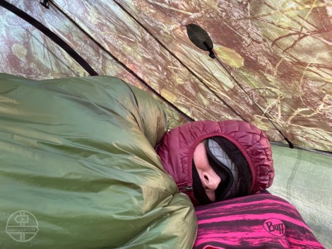 Vannacht werd ik wakker met een ijskoud hoofd. Ik sliep ‘alleen’ met de capuchon van mijn Patagonia Capilene Air-trui, een merinowol-synthetische mix. Ik heb halverwege de nacht m’n helmcap eronder opgezet, dit was een stuk beter. Toen ik wakker werd lag de temperatuur onder het dauwpunt. De quilt was nat geworden van mijn uitgeademde lucht. Terwijl om zeven uur werden we alweer aardig de tent uitgebrand door de zon.