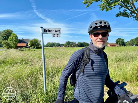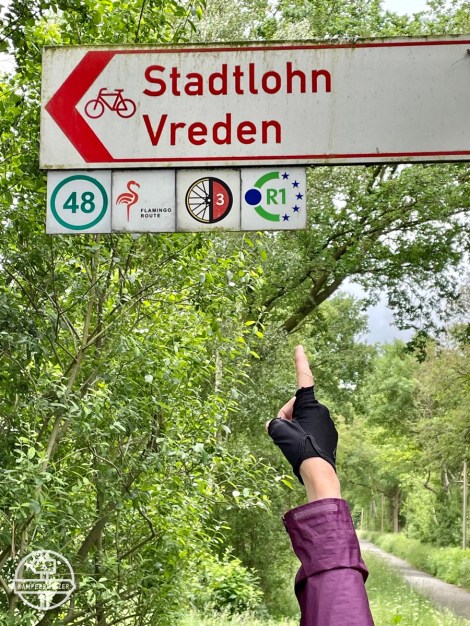 Wat ook niet helpt voor de sfeer: een overwoekerd welkom-in-Duitsland bord, grijs weer, af en toe motregen, een temperatuur van 13 graden en koude noorderwind. We fietsen de hele dag in regenpak tegen de waterkou! We zien de eerste R1-bordjes verschijnen aan de richtingwijzers. Ze zijn niet zo talrijk dat je er zonder kaart of route op kunt navigeren.
