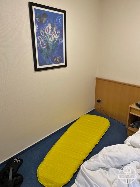 De kamer is typisch Duits ingericht met grenen meubels, blauw tapijt en een loei van een badkamer met van die spierwitte badkamertegels waarbij ik meteen associaties krijg met psychiatrische inrichtingen (teveel Hollywood gekeken). Het bed is doorgezakt dus ik rol mijn slaapmat uit op de grond.