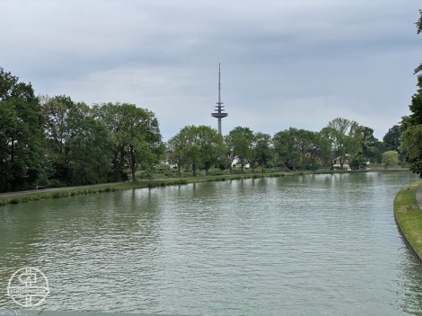 We werden mooi door Münster geleid, via een langwerpig park. Eenmaal de stad uit kruisten we een kanaal met groen water, het Dortmund-Ems-Kanal. Hier stond een soort van space age televisietoren.