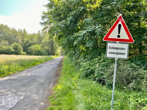 De Duitsers waarschuwen met borden veel duidelijker dan in Nederland voor de eikenprocessierups. Je ziet dan bijvoorbeeld bij een terras staan dat mensen met een allergie voor de eikenprocessierups hier moeten oppassen. De route was vandaag vlak maar morgen begint het klimmen.
