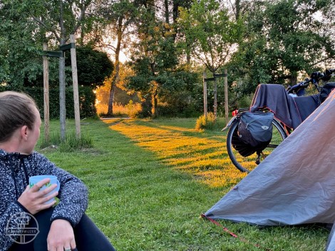 We fietsten deze eerste dag 50 kilometer naar Lunteren. We staan op een veld met allemaal caravans (met luifels aan de voortenten) maar de eigenaresse van minicamping De Wuitekamp begrijpt de noden van fietskampeerders. Ze wijst ons direct op stoelen die we kunnen gebruiken.