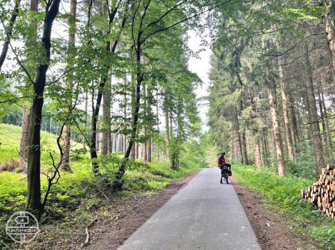 Vandaag veel gravelwegen (Schotterwege) door het bos. Vaak druk hier met mountainbikers en vooral wandelaars. Regelmatig zien we prachtige heldere snelstromende ondiepe brede beken en riviertjes en natuurlijk weer een slot met vijver op de route. Het wordt een beetje saai, maar deze elementen zitten tot nu toe nog in elke dagetappe.