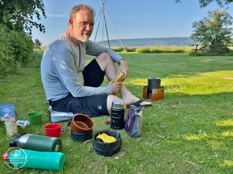 Mensen met caravans hebben al snel medelijden met ons. We kregen koffie aangeboden door een rokende medekampeerder maar sloegen beleefd af. Met ons regenpak aan hebben we ontbeten aan de pickniktafel met het lekkere warme expedition breakfast van Adventure Food en zetten we zelf koffie.