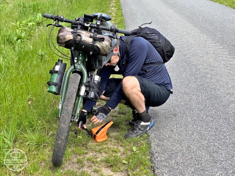 Vlak voor een afdaling tussendoor gaf ik Dave alvast zijn verjaardagscadeau dat ik had meegesmokkeld. Een ademend waterdicht vest van Endura. Ideaal in de combinatie warm weer en regen. Het is gemaakt van ExoShell20ST™ en heeft een MVTR van 20.000 g/m2/24u en een waterkolom van 15.000 mm. Stom om het in de tas te laten terwijl het nu de ideale omstandigheden zijn voor zo’n vest. Houdt de borst warm terwijl je lekker kunt koelen via je armen. Aanrader. De arme Dave heeft het geluk vaak in de vakantie jarig te zijn dus hij krijgt altijd lichtgewicht fiets- of outdoorspullen voor z’n verjaardag.