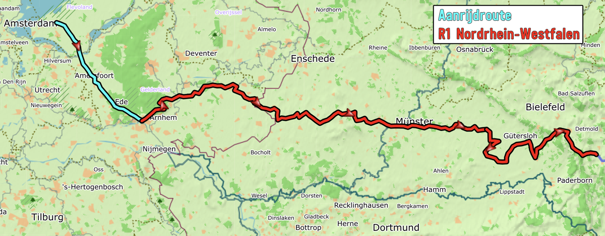 R1-1-NRW Gepubliceerd 04/08/2022 at 1200 × 469 in Fietsen naar Berlijn (1): Nordrhein-Westfalen ← Vorige Volgende → Aanrijdroute is aangegeven in andere kleur dan R1