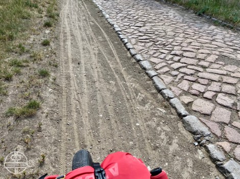 Onderweg komen we nu regelmatig irritante keitjes tegen waar je helemaal door elkaar geschud wordt, kinderkopjes zijn er niks bij: we zijn klaar voor Parijs-Roubaix! We zagen hier ook een afgebroken fietstashaak liggen, het verbaasde ons niets. De truc is overigens bij dit soort wegen om er náást te gaan rijden, niet erop!