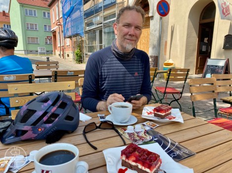 Het zijn Peter en Ute uit Berlijn, die met de peuter in de bakfiets op fietsvakantie zijn. Het zingen is om de peuter te entertainen, leren we. Peter wisselt het af met verhalen vertellen. We fietsen een tijdje met ze op, tot we in Köthen eindelijk een bakker tegenkomen die geopend is.