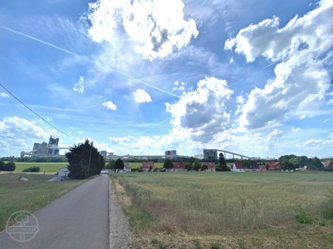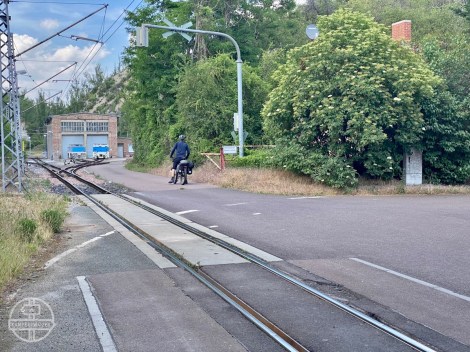 Onder weg doen we zoveel indrukken op: glooiende velden, stilte, ondiepe rivieren, landhuizen, torens, een giga fabriek. Er was een vreemde situatie met druk bereden smalspoor in de buurt van Bernburg. Hier gingen we niet overheen maar het kwam van rechts en liep vervolgens mee met de weg.