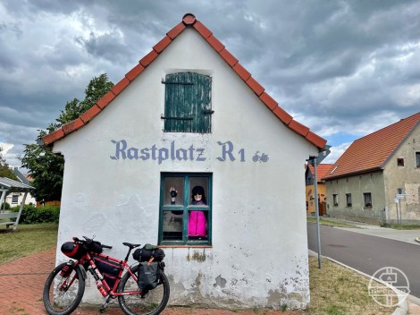 Toen ook in Biendorf het op de kaart gevonden restaurant verlaten bleek, gingen we daar maar op een bankje een fles This Is Food opdrinken. Komt er op een gegeven moment een bakfiets voorbij met een zingende vader en daar achter de moeder met een long-tail cargobike met alle bagage (een Yuba Mundo) en ze volgden de R1.