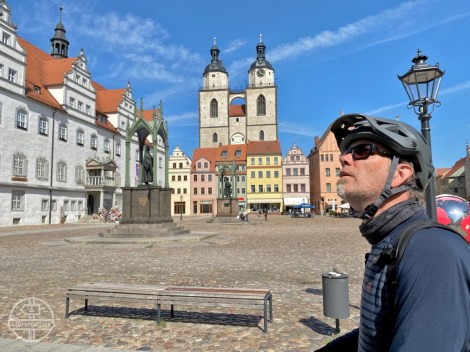 In Lutherstadt Wittenberg gaan we morgen een rustdag houden. In het Luther-Hotel zit een stilteruimte met bijbels en ook de kamer heeft er een. De sfeer van het hotel is er weer een van een instelling voor psychiatrie, hoewel het erger kan. Duitse ‘gezelligheid’ dus. Het helpt ook niet dat we een kamer geschikt voor gehandicapten hebben gekregen. Knappe invalide overigens die hier kan douchen, als fit persoon had ik er al genoeg moeite mee. Geen stahoogte door de verhoogde (?) douchebak en beugels en klapkrukjes als obstakels, dus ben weer een blauwe plek rijker. Maar de fietsen staan hier goed in de parkeerkelder en we zagen dat een ander hotel hier er nog veel erger uitzag qua sfeer. Het blijft Duitsland.