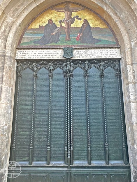 De deur waar Luther al dan niet vermeend zijn stellingen op heeft gespijkerd blijkt in 1740 afgefikt en vervangen door een bronzen deur met Latijnse tekst. De kerkdeur om de hoek zat tijdens openingstijden op slot. Vandaar de naam Slotkerk waarschijnlijk. Het is drukkend warm in de stad. We zien veel vakantiefietsen.