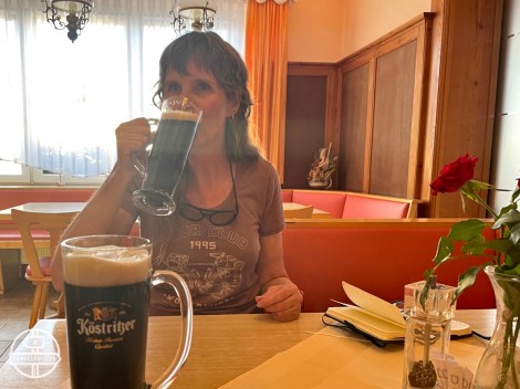 Nu we het over droogbloemen hebben, deze staan op onze hotelkamer in Brück. Samen met een schrootjeswand en een fotowand is het retro jaren ’70 stijl. We vinden de kamer leuk, het heeft tenminste karakter en lijkt daardoor niet op een kamer in een instelling, zoals in Lutherstadt Wittenberg en andere hotels die we onderweg tegenkwamen. De fietsen staan hier veilig in de garage. Op het menu staat ook nog Soljankasoep, dus we zijn helemaal blij. De eigenaars zijn heel vriendelijk.