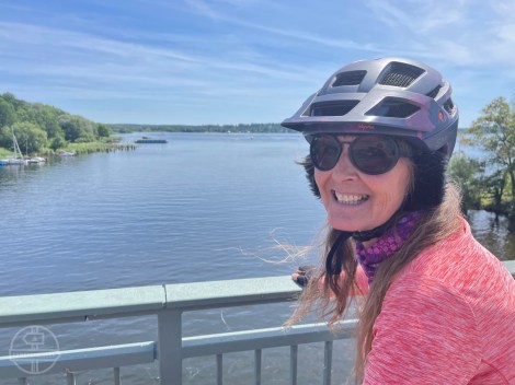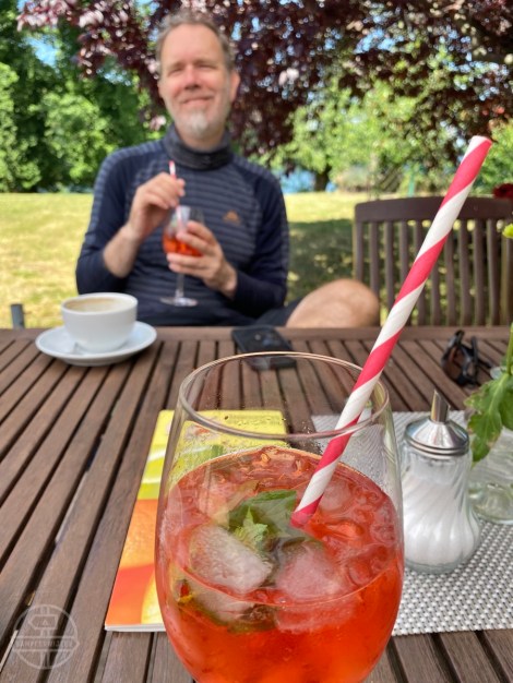 Daarna komen we via het prachtige merengebied in Potsdam. Die veertig kilometer vielen ons zwaar. Dat zat zo. We gingen lunchen bij een terras aan het water en zagen op de kaart een ‘bowl’ Erdbeer. Wij denken: we krijgen een schaal aardbeien met joghurt of slagroom. Het bleek echter een cocktail van wijn met aardbeien. Fietsen in de warmte de heuveltjes op ging daarna heel zwaar. Zo werd het toch nog een beetje een uitdaging.