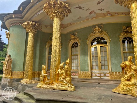 ’s Middags wandelen we door park Sans,Souci en bekijken we de drie paleizen die daar staan. Deze paleizen en parken van Potsdam en Berlijn staan eveneens op de UNESCO Werelderfgoedlijst. Het zijn overblijfselen van het keizerrijk in de Pruisische tijd. De paleizen zijn van een schaal, dat kennen we niet in Nederland. Slot Sans,Souci, het Nieuwe Paleis en het Orangerieschloss zijn niet de enige optrekjes in dit park. Er staat onder andere nog een Chinees huis en de grot van Neptunus. De Efteling is er niks bij vergeleken.