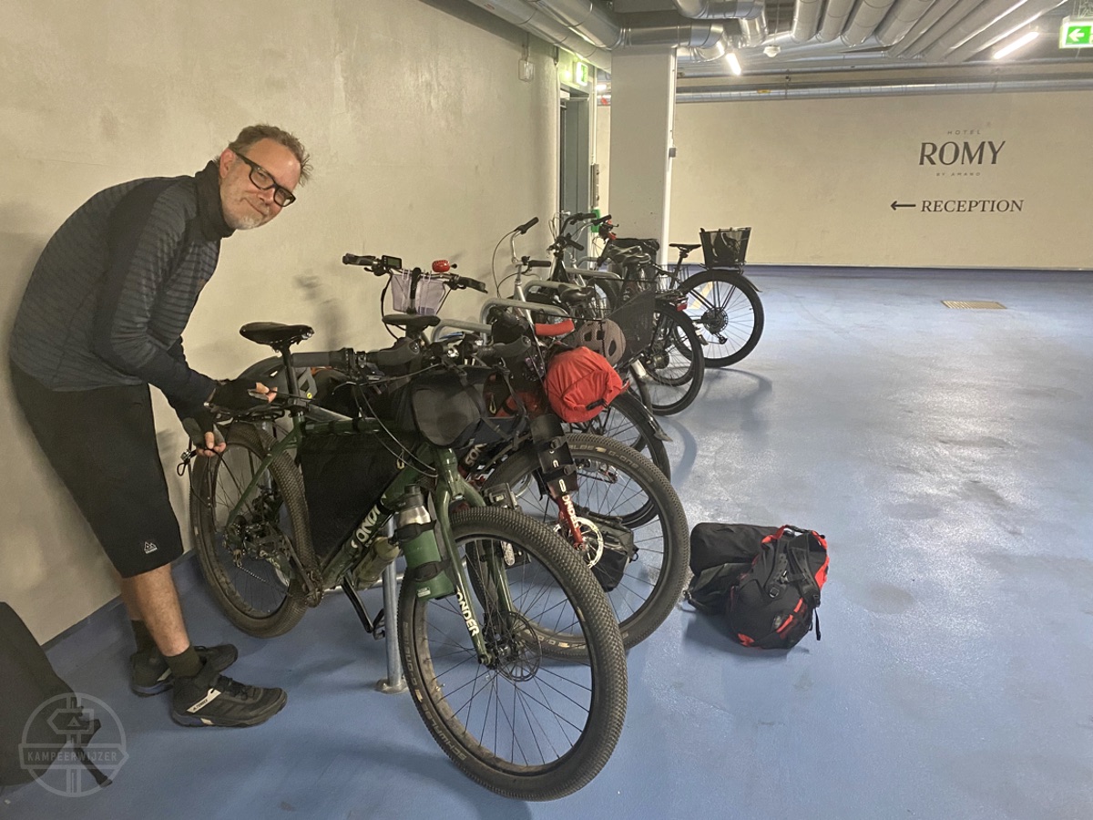 R1-618-dave-in-niet-bestaande-fietsgarage Gepubliceerd 18/08/2022 at 1200 × 900 in Fietsen naar Berlijn (4): Brandenburg en Berlijn ← Vorige Volgende → Dave in de niet-bestaande fietsenkelder van hotel Romy by Amano