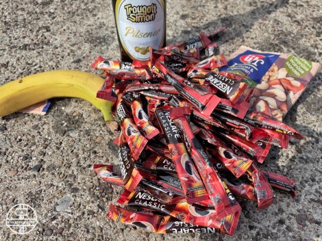 De donkerrode zakken van Kellogs hadden als voordeel dat ze goed hersluitbaar zijn. Het was ook de muësli die het meest calorierijk was in het schap van de supermarkt. Deze muësli kwam in verschillende smaken, onder andere red berries en choco & nuts. Niet alle zakken wegen evenveel. We kozen meestal voor de smaken in zakken van 500 gram, zoals de classic. Goed voor twee personen voor twee dagen. Voordeel van muësli boven havermout is dat het sneller klaar is en geen brandstof vereist en je hoeft geen pannetje af te wassen. Havermout kan je ook ’s nachts weken maar Dave houdt er niet van.