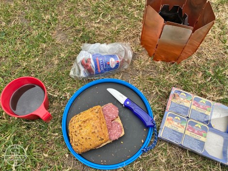 Als snijplank gebruiken we de X-plate borden van Sea To Summit. Maar met bijvoorbeeld harde worstjes moet je wel uitkijken. Als je uitschiet met een scherp mes snij je de rand van het bord kapot. Die worstjes waren overigens zo hard dan ons lichtgewicht mesje (Rubytec Ceram keramisch zakmes) het begaf en we dit later hebben vervangen door een mesje van Opinel.