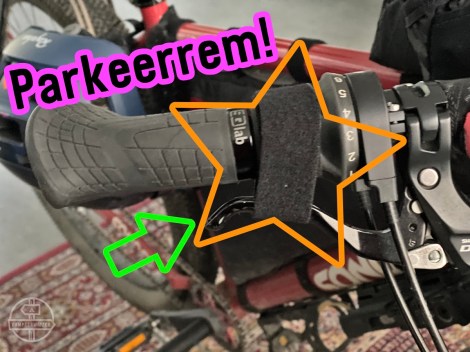Met een elastiek gemaakt van een reep oude binnenband of een stuk klittenband dat je over hebt, zet je in een handomdraai je voorrem vast. De fiets staat hierdoor goed vast in bijvoorbeeld de trein of op aflopend terrein. ZO GOED ALS GRATIS!!!