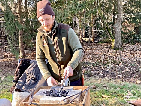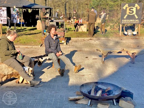 We waren op tijd terug voor de lezing over de workshops en cursussen die je bij Siegurd kunt volgen. Het verschil tussen workshops en cursussen is dat workshops één dag duren en cursussen meerdere dagen met overnachting. Je kampeert dan wild onder een tarp of neemt je eigen tent mee. Het was een goed teken om te zien dat er onder de bezoekers veel mensen waren die al eerder een workshop of cursus bij Siegurd hebben gevolgd en terugkwamen voor meer. Er is naast meer en minder uitgebreide bushcrafttrainingen nog van alles te doen en leren. Een greep uit het programma: bijlgebruik, vuur, vezels en touw, vlechten met wilg, natuurfotografie, smeden, mes en bijl slijpen, brood maken.