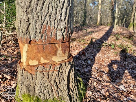 Verder zagen we bomen die geringd waren. Dit wordt met name gedaan bij exoten als de Amerikaanse eik en Douglas sparren. Door het afsnijden van de sapstroom sterft een boom langzaam af, zodat niet meteen alle stikstof weer vrijkomt. Er leven in staande dode bomen andere dieren en insecten dan liggende, daarom is het ook interessant om een boom staand af te laten sterven. Veel wordt de techniek momenteel niet toegepast op de Utrechtse Heuvelrug: in 2021 velde een valwind in Leersum honderd hectare aan bomen. Voorlopig zijn er genoeg dode bomen.