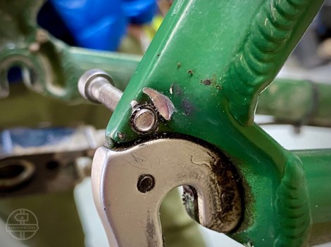 Het probleem dat we een busje moesten gebruiken, was volgens Marten ook de oorzaak van het lostrillen. Met een kunststof busje blijf je aandraaien, volgens hem. Zijn oplossing was wat meer ruimte te creëren voor het bevestigen van de bagagedrager, door een stuk van de verdikking bij het gat weg te slijpen.