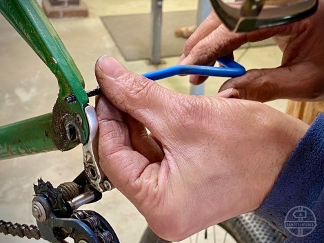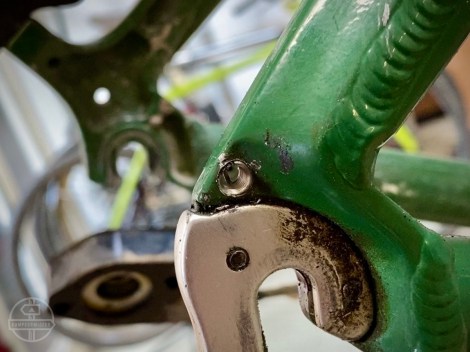 Al met al lijkt het een simpel klusje, maar je ziet aan de foto’s hoe dicht het schroefgat bij de rand zit. Daarbij moest de schakelbox van de Rohloff-naaf losgehaald, het achterwiel eruit en de bagagedrager verwijderd worden. Dat kunnen we allemaal zelf ook, maar je bent toch even bezig.