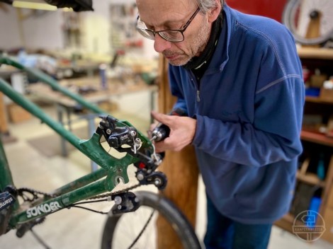 Zo kwam het dat we voor één boutje, maar wel een belangrijk boutje, ruim 300 kilometer op-en-neer naar Groningen reden*. Het maakt Marten namelijk niet uit of je binnenstapt met een fiets die hij zelf heeft gebouwd, een antieke Manufrance of met een exemplaar van de Decathlon, al zal hij het niet nalaten op fietsen uit de laatste categorie wat kritiek te leveren. “Kijk, dit is typisch een geval dat ze in aluminium een stalen frame nabouwen, zonder rekening te houden met het materiaal.” Aluminium is zacht en een schroefgat zo dicht bij de rand in aluminium is dus niet zo’n goed idee, volgens Marten.