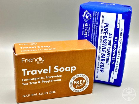 Een bekend merk voor alles-in-een reiszeep is Dr. Bronner’s. Backpackers kiezen vaak de pepermunt-versie omdat ze die smaak prettig vinden om er ook hun tanden mee te poetsen. Dr. Bronner heeft een uitgebreid cheat sheet gepubliceerd over waar je hun Pure-Castile Soap Bar’s allemaal voor kunt gebruiken. Handig voor kampeerders: je kan er ook de afwas mee doen en je kleding wassen. Hoewel je voor het laatste beter apart wasstrips (Brauzz, TruEarth…) kunt meenemen want Dr. Bronners adviseert om voor het wassen van kleding aan hun zeep tevens baking soda (zuiveringszout) toe te voegen.