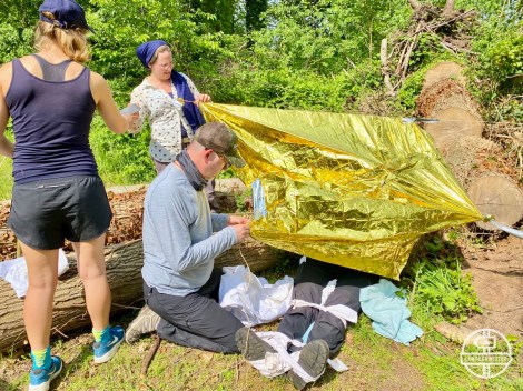 We oefenden verder met onderkomens maken. Een slachtoffer met een hitteberoerte hielden we uit de zon met een reddingsdeken met de zilveren kant boven. Later kregen we de opdracht om een onderkomen te bouwen voor twee slachtoffers, omdat er een storm op komst zou zijn. Maar of de reddingsdekens heel zouden zijn gebleven in een echte storm? Waarschijnlijk was het beter geweest het slachtoffer er in te wikkelen.