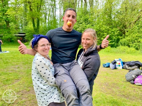 Hilarisch was de estafette verbanden aanleggen met een driekante doek. In twee groepen moesten we proberen zoveel mogelijk verschillende verbanden aan te leggen bij het slachtoffer. Moraal van het verhaal: met een steriel gaasje en een driekante doek kan je elk lichaamsdeel verbinden. Of het nu een oog, een knie of een buikswond betreft.