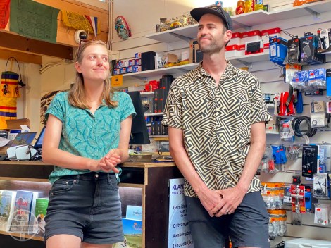Alee Denham in de winkel De Vakantiefietser in Amsterdam