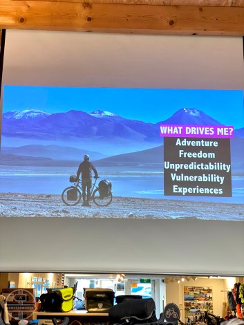 De presentatie werd door Alee (34) samen met zijn nieuwe Amerikaanse vriendin Laura (32) gegeven en begon met informatie over wie ze zijn, wat hun drijfveren zijn, etc. Op een onderbreking tijdens corona na, is Alee al elf jaar non-stop onderweg op de fiets, reed hij door meer dan honderd landen en legde hij ongeveer 150.000 kilometer af door vijf continenten.