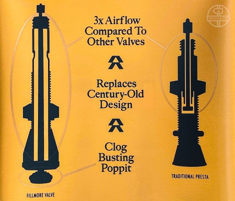 Wielbouwer Reserve Wheels is een stap verder gegaan. De wensen waren niet alleen een grotere luchtstroom, zodat de band makkelijker tubeless te monteren is, maar ook dat het ventiel minder snel verstopt raakt met sealant. Van hun ventielontwerp, de Fillmore, is het hele binnenwerk herzien. Hierdoor wordt het mogelijk om met je gewone fietspomp en zelfs een handpomp een band tubeless te installeren. Je hebt dan geen ‘booster’ pomp met drukvat meer nodig. En dat is vooral erg handig tijdens het moeten vervangen van de band tijdens een fietsvakantie.