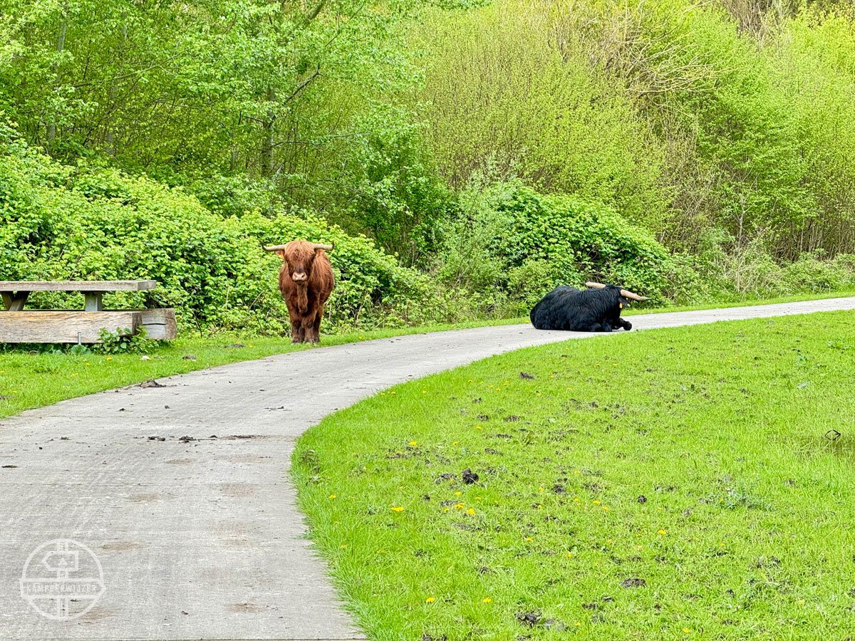 Het Horsterwold zelf was zeer drassig. Er stond een grote plas op het fietspad en links en rechts leek het wel een ondergelopen rijstveld, waterplassen waar grassprietjes bovenuit komen. Ik gaf de runderen daarom gelijk dat ze op het fietspad bleven liggen, terwijl ik met mijn fiets door de blubber ging om zoveel mogelijk afstand te bewaren.