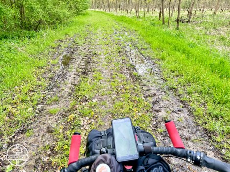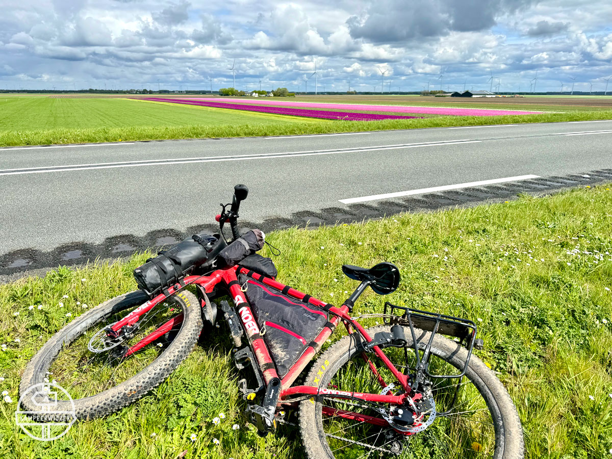 Ik had een gravel-route gemaakt met Komoot en het is niet de eerste keer dat ik daarmee de blubber in werd gestuurd. Door het Hulkesteinse bos liep een pad met diepe sporen van bosbouwmachines. Toen ik het bos uitkwam stond ik oog in oog met een groot wit tulpenveld.