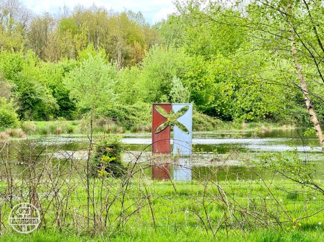 Bij de eerstvolgende kruising keek ik om. Er werd niet aangegeven dat dit een doodlopende weg was. Ik vermoed dat de situatie redelijk recent is. Volgens Google Maps ligt het landgoed alleen ten oosten van deze weg, nu dus aan beide zijden. Ik vervolgde mijn weg en werd getracteerd op een kunstwerk van een Libelle, in de Hulkensteinse kreek.