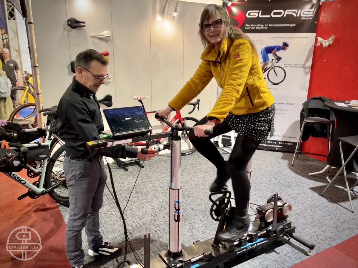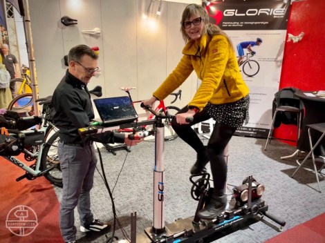 Op de stand van Glorie’s Bikelab stond ook de pasfiets die hij gebruikt voor de juiste verhoudingen. Het was het na afloop van de lezing een drukte van belang met mensen die last hadden van zadelklachten of hun rug, nek of polsen. Ze kregen gratis adviezen en ondertussen stroomde de agenda van Glorie vol met afspraken.