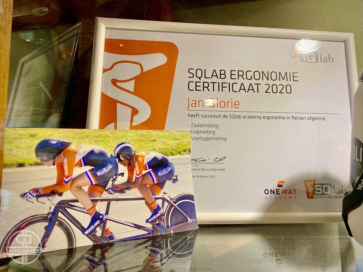 Na het lichamelijk onderzoek, het planken en stretchen konden we plaatsnemen op de pasfiets. We werden op verschillende zadels gezet. Sommigen leverden mij echt een scherpe zenuwpijn op bij de zitbotten maar opvallend was, dat een iets andere kanteling van het zadel dat al kon wegnemen. Vreemd genoeg kwamen we allebei op hetzelfde zadel uit, een SQ Lab 602. Dit zadel beweegt flexibel mee met de trapbeweging en daardoor zit je er met je heupen en onderrug minder star op. Dave heeft echt nog geprobeerd een ander zadel leuker te vinden maar de uitslag was: ANWB-stel. Wat ook al bleek uit dat we allebei op dezelfde manier verkeerd op onze fietsen zaten in de visie van Glorie.