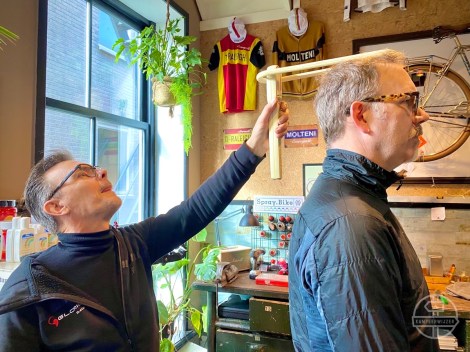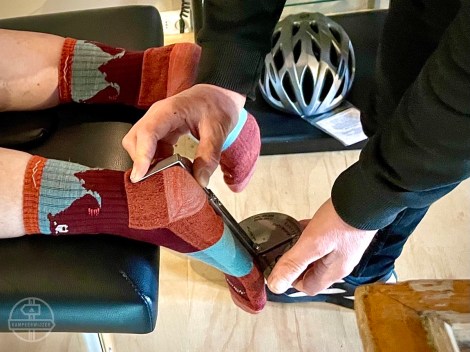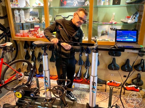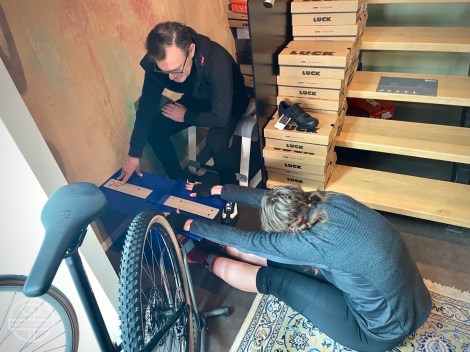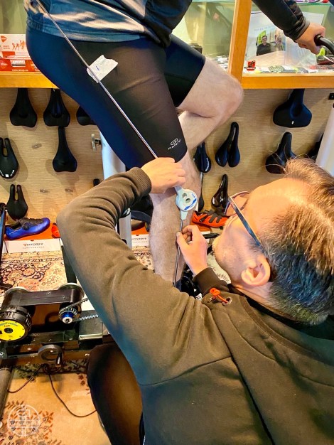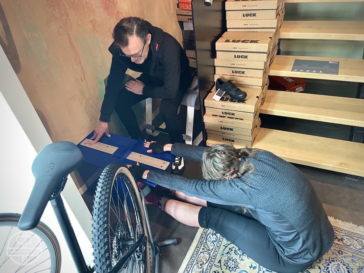 Het Bikelab blijkt gehuisvest in een hippe fietsenwinkel met bijzondere fietsen, midden in het centrum van Meppel. De dag begon met rondjes fietsen op onze eigen fiets in de winkelstraat, waarbij Jan eigenlijk al meteen ziet waar de schoen wringt. Hoewel 80 procent van de mensen die bij Glorie komen voor een bikefit op een te grote fiets zitten, zaten wij volgens hem allebei op een te kleine fiets. Dat was bijzonder, want volgens de maten van Alpkit zat ik tussen een medium en large frame in en heb ik gekozen voor large vanwege mijn beenlengte. Precies zoals het advies tijdens zijn lezing luidde.