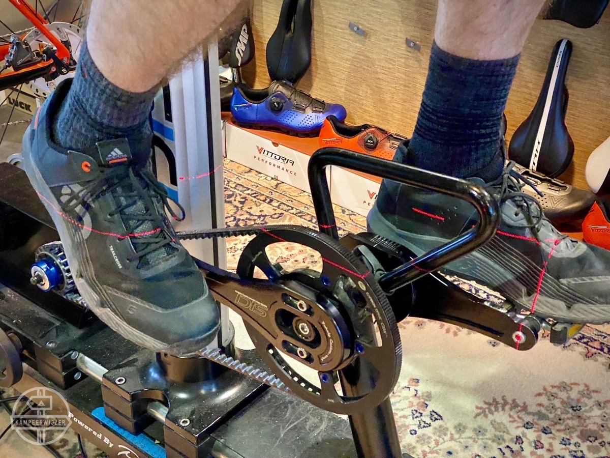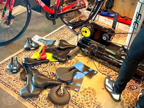 De lezing van Glorie bracht ons op het idee om weer eens een bikefit te gaan proberen, ook al was de vorige niet zo’n succes. Dave zoekt een vervanging voor zijn zadel, mocht de B68 het definitief begeven. Op zich zitten we prima op onze Sonder Frontier ATB’s en ervaren we vooral problemen op onze binnenfietsen, een Wahoo Kickr en Tacx Neo Bike. Op dit soort trainingsfietsen zit je zeer statisch want je staat er letterlijk stil op, je zwaait niet eens naar links en rechts, zoals op een gewone fiets. Hierdoor krijg je eerder pols- en zadelklachten.