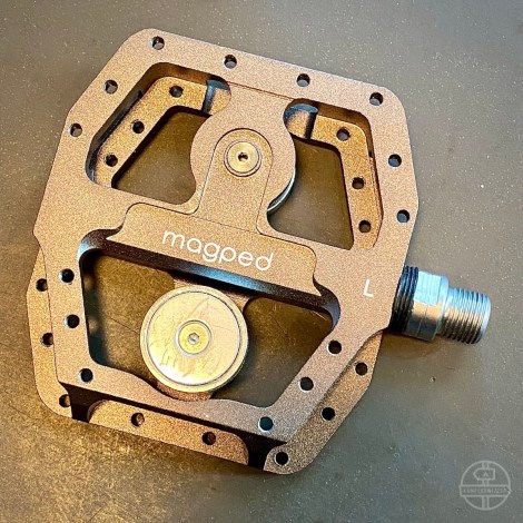 Glorie liet een interessant klikpedaal zien met een magneet, de Magped. Voordeel van dit systeem is dat je een mooi vlak schoenplaatje hebt, dat wegvalt in de schoen en je kan je voet neerzetten hoe je wil, dus je hebt maximale float. Uiteraard minder geschikt voor racefietsers die echt hard willen trekken aan de pedalen. Maar zou ik weer gaan ligfietsen, dan zou ik dit pedaal zeker overwegen.