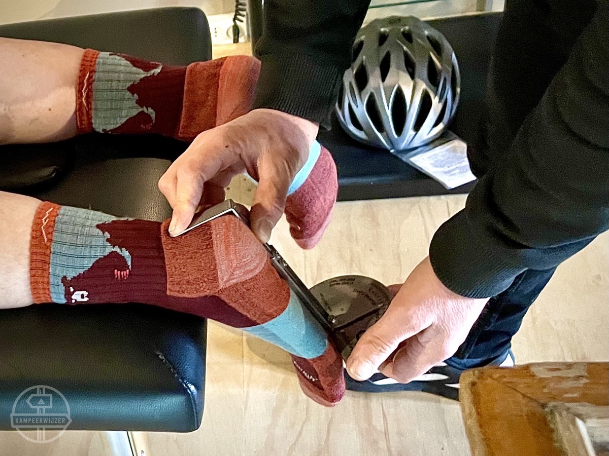 Jan liet me ook het verschil voelen tussen 175 en 170 mm cranks. Ik vind de hefboom van een 175 lekkerder aanvoelen maar toch adviseerde hij om terug te gaan naar 170 omdat dit beter is voor de knieën. Het is maar 5 millimeter, maar toch is het verschil goed te voelen op de pasfiets. Uiteindelijk fietsten we allebei op de pasfiets 5 kilometer tijdens de gehele bikefitting.