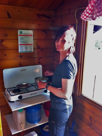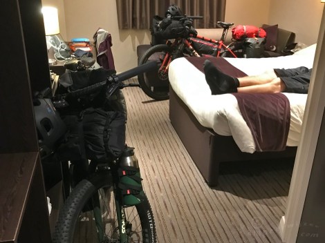 Nat, koud en miserabel en geen goede weersvooruitzichten. Regen en/of storm. Uitwijken naar een hotel wordt meestal pas aan het eind van de middag besloten, dan pakken we er een app om een hotel te boeken erbij (hail internet!) en zoeken een droog onderdak voor de nacht. Op die manier proberen we te voorkomen dat we een natte tent in moeten pakken en kunnen we zelf een beetje opdrogen. Het moet wel leuk blijven, kamperen is geen moeten. Overigens is dit wel minder een must geworden sinds we een tent hebben van Dyneema, een materiaal dat geen vocht opneemt.