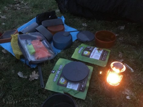 In 2005 kochten we bij Cabela’s in Pennsylvania voor het eerst gevriesdroogde maaltijden in foliepakken met druksluiting. Je giet er kokend water in, roert en laat het foliepak 10 minuten gesloten staan. Kant-en-klare hooikistmethode. Inmiddels is dit ook allang in Nederland te koop. De maaltijden zijn ook steeds smaakvoller geworden. Je eet rechtstreeks uit het pak met een extra lange lepel.